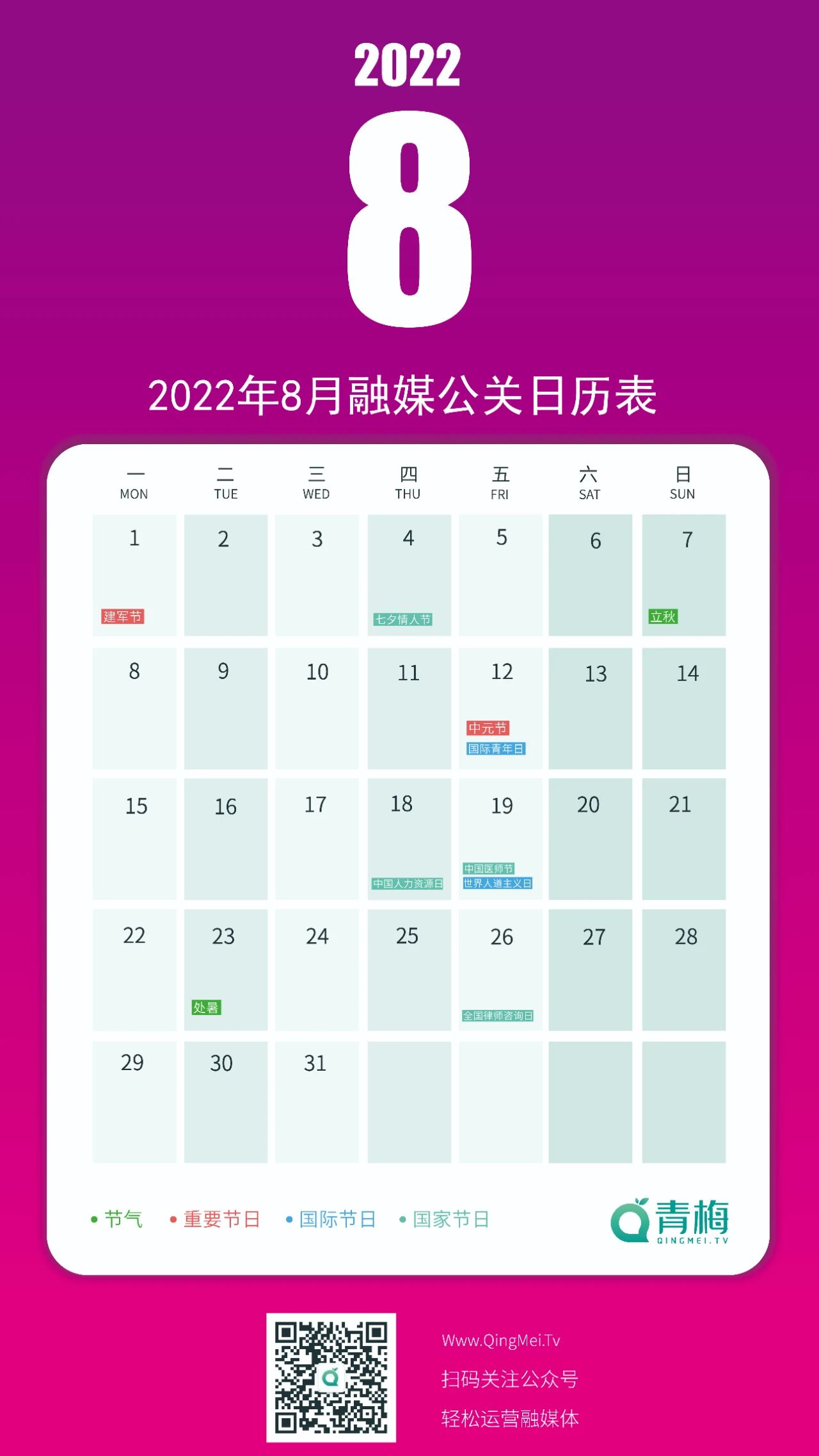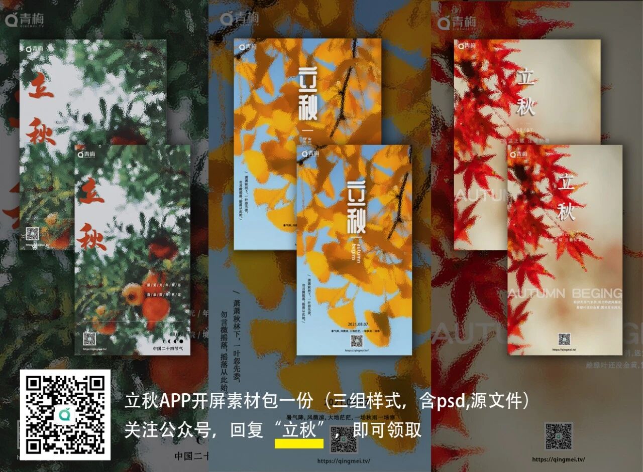 立秋APP开屏素材包一份(三组样式,含PSD源文件)关注公众号,回复“立秋”,即可领取。附:8月融媒公关日历