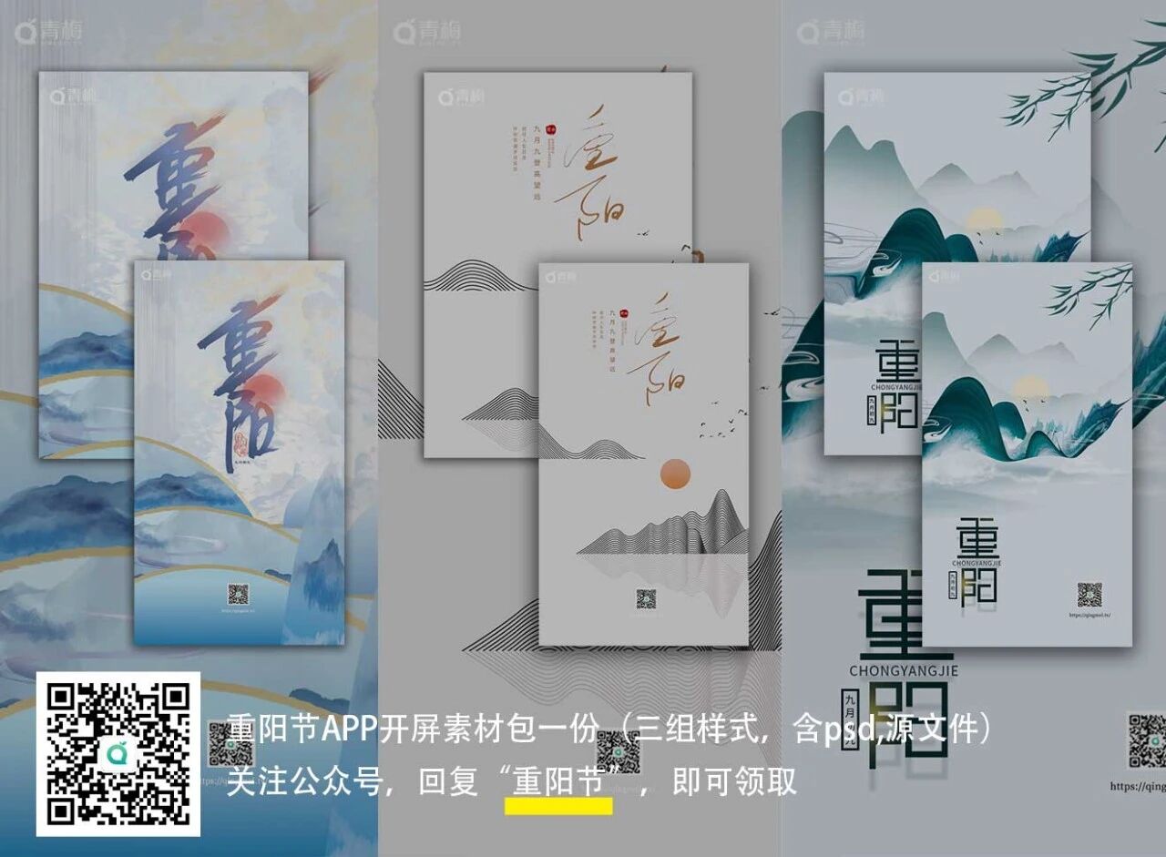 重阳节APP开屏素材包一份(三组样式,含PSD源文件) 关注公众号,回复“重阳节”,即可领取。